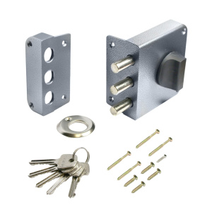 Замок накладной цилиндровый с вертушкой. Предназначен для установки на деревянные двери. Три засова круглого сечения d=13мм с максимальным вылетом 28 мм. Удаление ключевого отверстия - 60 мм. Габариты замка - 100х110х55 мм. Комплектация - 5 ключей, запорная планка, накладка. Механизм замка под англ.ключ, идет совместно с корпусом. Закрывание и открывание замка изнутри производится вертушкой, снаружи ключом.