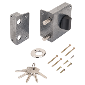 Замок накладной цилиндровый с вертушкой. Предназначен для установки на деревянные двери. Два засова круглого сечения d=13мм с максимальным вылетом 28 мм. Удаление ключевого отверстия - 60 мм. Габариты замка - 100х110х55 мм. Комплектация - 5 ключей, запорная планка, накладка. Механизм замка под англ.ключ, идет совместно с корпусом. Закрывание и открывание замка изнутри производится вертушкой, снаружи ключом.