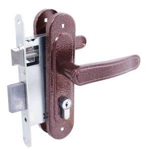 Замок врезной с ручками, цилиндровый. Предназначен для установки в деревянные двери толщиной 40-50мм, правого и левого открывания. Стальной оцинкованный корпус. Прямоугольный ригель из цинкового сплава, вылет 22мм. Межосевое расстояние 55мм. Удаление ключевого отверстия 55мм. Габаритный размер 85х130 мм. Ручки - сталь, алюминиевый сплав, покрытие - краска, крепление - стяжками. Комплектуется цилиндровым механизмом 70мм с 4 ключами. 15000 секретных комбинаций.