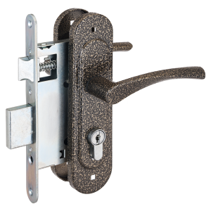 Замок врезной с ручками, цилиндровый. Предназначен для установки в деревянные двери толщиной  40-50мм, правого и левого открывания. Стальной оцинкованный корпус. Прямоугольный ригель из цинкового сплава, вылет 22мм. Межосевое расстояние 55мм. Удаление ключевого отверстия 55мм. Габаритный размер 85х130 мм. Ручки - сталь, алюминиевый сплав, покрытие - краска, крепление - стяжками. Комплектуется цилиндровым механизмом 70мм с 4 ключами. 15000 секретных комбинаций.