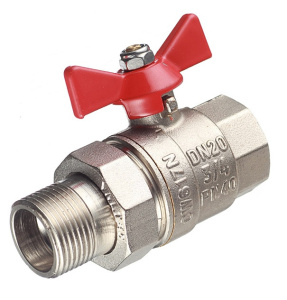 Прямой полнопроходной ремонтопригодный шаровой кран с увеличенным ресурсом. Соединен накидной гайкой с резьбовым полусгоном. Корпуса деталей – латунные, никелированные. Кран оснащен ручкой типа «бабочка» с утолщенной стенкой из алюминиевого сплава и эпоксидной покраской. Резьба присоединений – внутренняя/наружная.