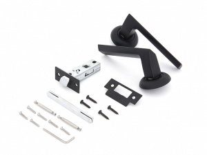 Ручка дверная В комплекте: дверные ручки на круглой розетке (2 шт.), врезная защелка, ответная планка, квадрат 8x8 мм, шестигранник, стяжные винты, шурупы. Материалы: алюминий, сталь Цвет: черный