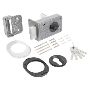 Замок накладной цилиндровый с вертушкой. Предназначен для установки на деревянные двери. Комплектация - 5 ключей, запорная планка, накладка. Механизм замка под англ.ключ, идет совместно с корпусом. Закрывание и открывание замка изнутри производится вертушкой, снаружи ключом. Имеет возможность ночной фиксации засова изнутри.