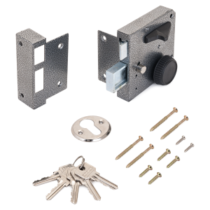 Замок накладной цилиндровый с защелкой и вертушкой. Предназначен для установки на деревянные двери. Один засов прямоугольного сечения размера 27*12 мм , с максимальным вылетом 25 мм. Удаление ключевого отверстия - 60мм. Габариты замка - 95х95х53 мм. Комплектация - 5 ключей, запорная планка, накладка. Механизм замка под англ.ключ, идет совместно с корпусом. Закрывание и открывание замка изнутри производится вертушкой, снаружи ключом. Защелка изнутри открывается ручкой защелки, снаружи - ключом.