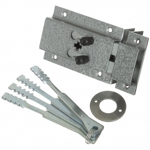 Накладной замок "Делга" КОМАЗ-ОХК с двумя прямоугольными ригелями. Тип механизма секретности - реечный. Способ открытия/ закрытия изнутри - ручкой. Удаление ключевого отверстия - 42мм