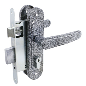 Замок врезной с ручками, цилиндровый. Предназначен для установки в деревянные двери толщиной 40-50мм, правого и левого открывания. Стальной оцинкованный корпус. Прямоугольный ригель из цинкового сплава, вылет 22мм. Межосевое расстояние 55мм. Удаление ключевого отверстия 55мм. Габаритный размер 85х130 мм. Ручки - сталь, алюминиевый сплав, покрытие - краска, крепление - стяжками. Комплектуется цилиндровым механизмом 70мм с 4 ключами. 15000 секретных комбинаций