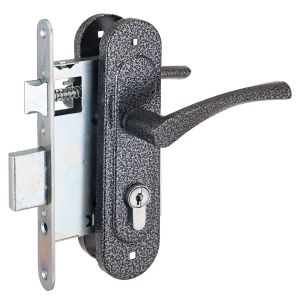 Замок врезной с ручками, цилиндровый. Предназначен для установки в деревянные двери толщиной 40-50мм, правого и левого открывания. Стальной оцинкованный корпус. Прямоугольный ригель из цинкового сплава, вылет 22мм. Межосевое расстояние 55мм. Удаление ключевого отверстия 55мм. Габаритный размер 85х130 мм. Ручки - сталь, алюминиевый сплав, покрытие - краска, крепление - стяжками. Комплектуется цилиндровым механизмом 70мм с 4 ключами. 15000 секретных комбинаций.