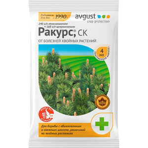 Эффективное лекарство для борьбы с обыкновенным и снежным шютте, ржавчиной на хвойных растениях. Быстро проникает в ткани растения и не смывается дождем уже через 2 часа после опрыскивания. Имеет выраженное профилактическое и лечащее действие. Обладает искореняющим действием, препятствуя появлению спор возбудителей. Благодаря сильным системным свойствам распределяется во всех вегетирующих частях растения (от основания до верхушки).